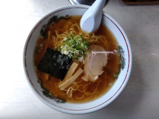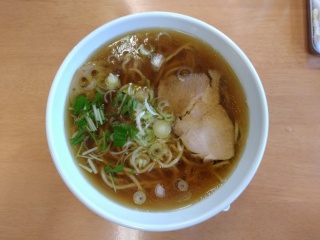 さらりとした魚介系のスープで、 麺は中細の縮れ麺。具はチャーシュー、シナチク、そして麩。
