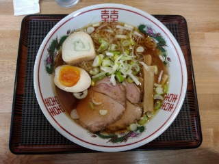 醤油、塩、味噌の三味揃っているメニューから、醤油味の志那そばをいただきました。細い縮れ麺にあっさりスープを合わせた淡麗なラーメン。チャーシュー、メンマ、ネギ、味玉、麩が入ってます。
