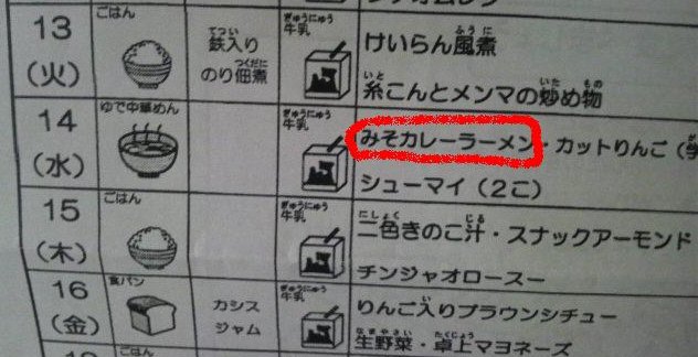 青森市内の全部の小学校がそうなのか知りませんが、うちの子の今日の給食メニューは「みそカレーラーメン」だそうです。