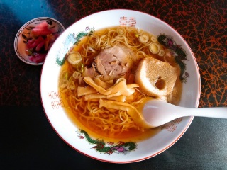 細い縮れ麺を使ったあっさり味の醤油ラーメンです。メンマ、ネギ、チャーシュー、麩が入ってます。