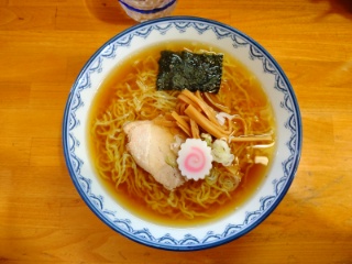 細縮れ麺に具はナルト、海苔、メンマ、チャーシュー、ネギ。スッキリした美しいスープは鶏ガラと煮干しでしょうか?塩分控えめな優しい味のラーメンです。
