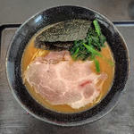 濃厚な豚骨ベースのスープに本家より太めの麺。シャキシャキのネギ、チャーシュー、ワカメ、海苔がトッピング。
