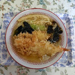 えび天中華そばをいただきました。いわゆる天中華ですね。えび天が2本乗っかってます。とても優しい煮干スープにえび天の油が広がります。懐かしさを感じる麸と穂先メンマも嬉しい具材ですね。