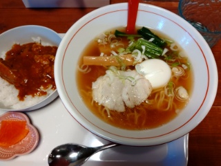 ラーメンが数種類ありましたが、正油ラーメンとミニカレーのセットにしました。とても旨味があるスープに中細縮れ麺。極太なメンマが2本とゆで玉子、ホウレン草、チャーシュー、ネギが入ってます。