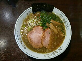 チャーシュー、シナチク、ネギ、ゆで卵、麩が入った塩っ辛いラーメンです。