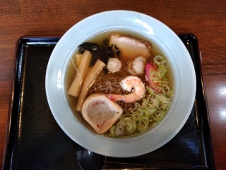 さて、トッピングが豪華です。ホタテ、エビ、ワカメ、チャーシュー、ナルト、ネギ、メンマ、麩。あっさりしたスープのラーメンです。サービスでライスも付きます。