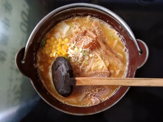 ラーメンが鉄鍋で出て来る「たぬき亭本店」に行ってきました。「完熟魚介味噌」「完熟胡麻味噌」「完熟豚骨味噌」にはそれぞれ、みそネギ、みそネギ味玉、みそ焼豚、みそバターコーン、辛みそ、牛乳みそ、牛乳みそカレー、牛乳辛みそ、などがあり味噌ラーメンのメニューが豊富です。麺は無添加自家製麺。