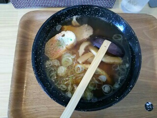 焼き干し出汁のあっさりしたスープに、ツルンとした喉越しの良い手もみ麺です。ラーメンに麩が入るのが浪岡らしい特徴です。