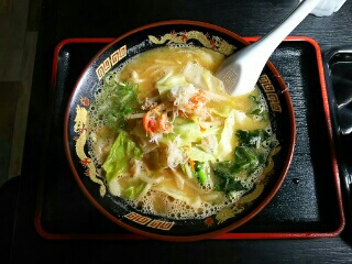蟹みその風味で野菜たっぷりと蟹の身がちょこんと乗ってます。細麺でさっぱりとしたスープのラーメンでした。