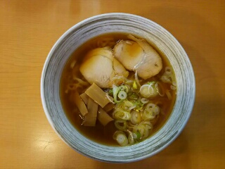 中華そばの麺は中細の縮れ麺。スープは煮干し、昆布のあっさり味です。具はチャーシュー、ネギと、ピリ辛のシナチク。