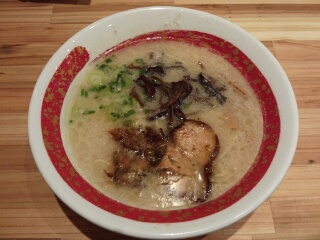 硬めに茹でられた細い縮れ麺に、具はチャーシュー、海苔、ナルト、メンマ、ネギ。