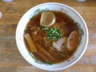 鶏ガラと煮干しのスープに中細の縮れ麺を合わせたスッキリした味の津軽中華ですね。具はメンマ、チャーシュー、ネギ、ナルト、麩。