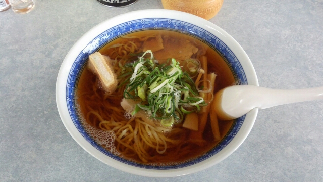 配膳されたラーメンをいただく。油が結構浮くチキンっぽい醤油ラーメン。