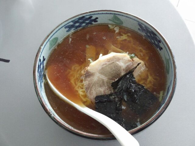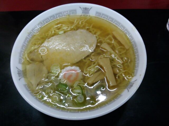 ラーメンは結構な油が浮いてますが基本的にはあっさりラーメン。ゆるい縮れのある細麺に、海苔、チャーシュー、ナルト、メンマ、ネギ。