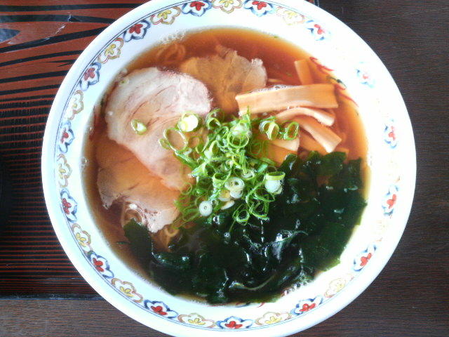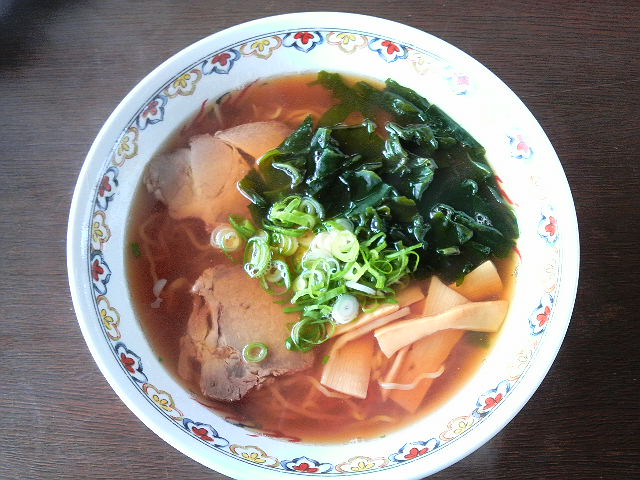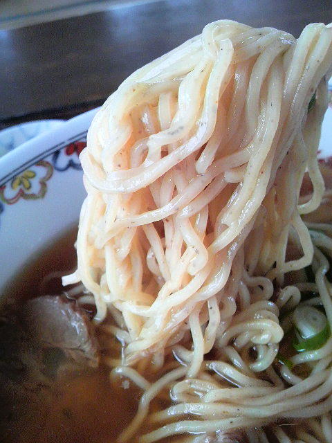 細い縮れ麺に、具はシナチク、チャーシュー、長ネギ、ワカメ。