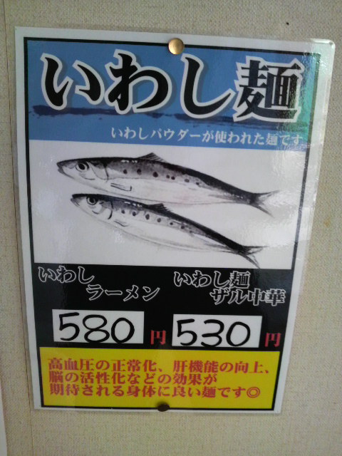 いわしパウダーを使った麺だそうで、いわしラーメン(580円)と、いわし麺ザル中華があるようだ。