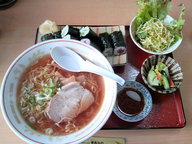 配膳されてビックリ!見た目に豪華。ラーメンと海苔巻きの皿が登場すると思っていたら、お盆には野菜サラダと漬け物とお茶が付いてきました。