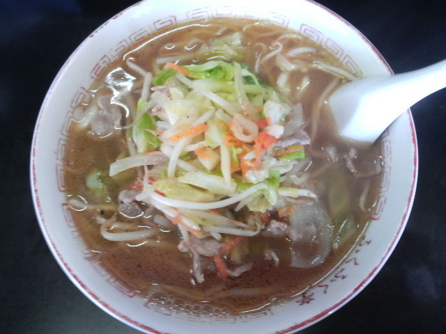 正油ラーメンも味噌ラーメンと同じで、具は挽き肉、メンマ、ワカメと、野菜はモヤシと玉ねぎ。