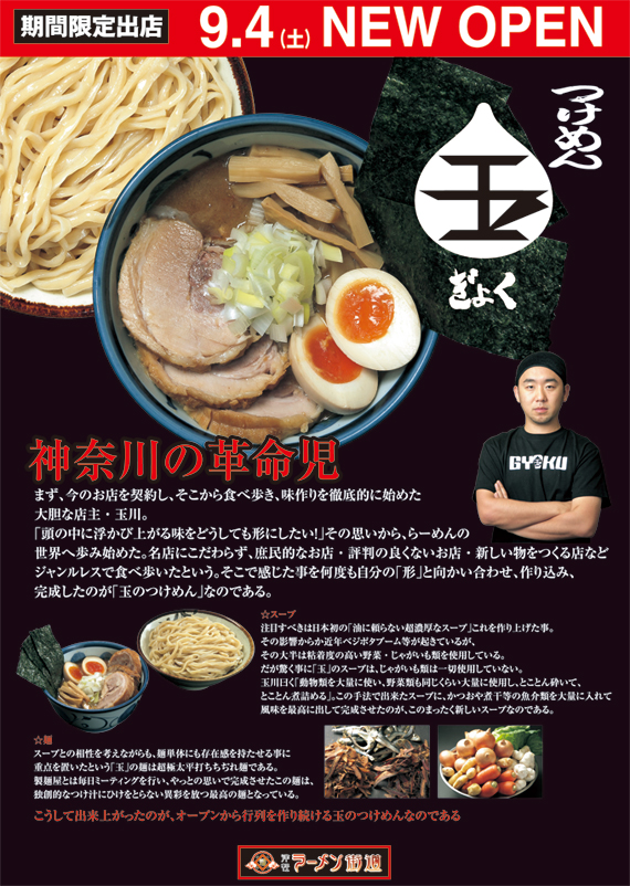 津軽ラーメン街道に濃厚豚骨魚介+極太つけ麺の人気店「つけめん玉(ぎょく)」が、9月4日に期間限定でオープンしました。