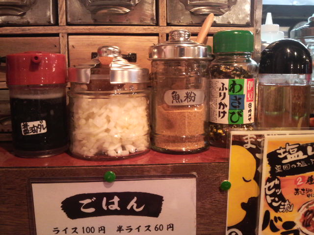 ブラックペッパー、ホワイトペッパー、唐辛子の他に、柚子酢、魚粉、玉ねぎザク切りなどがあります。