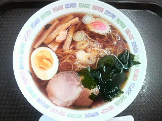 今回は醤油ラーメンを食べました。お盆、レンゲ、どんぶり、はし、小皿が全てプラスチック製品なのが職員食堂っぽい感じがします。