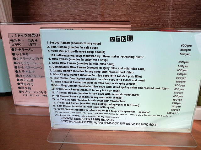 みそラーメンは何種類かのメニューがあって、それぞれ「赤みそ(ピリ辛)」「白みそ(甘口)」「合わせみそ(2種混合)」の中から指定します。今回は赤みそにしました。