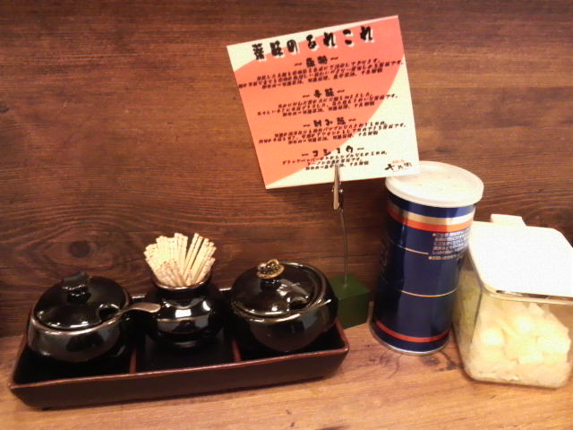 薬味には、本鰹と宗田節をブレンドした「魚粉」と、花鰹と鷹の爪の「辛味」と、「刻みタマネギ」「ブラックペーパー」が用意されてます。