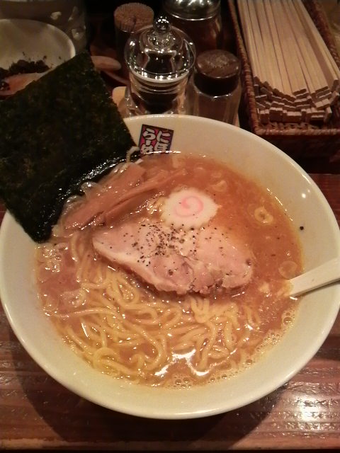 らーめんをいただきましたが、スープは煮干しなどの魚介とトンコツのWスープで、あっさり目の味です。最初から煮干しがガツン!と来る青森の煮干しラーメンと違って、食べていくうちに段々と動物系の陰に潜んでいる煮干しの旨さを感じます。自分で煮干しのふりかけを掛けて調整も可能。