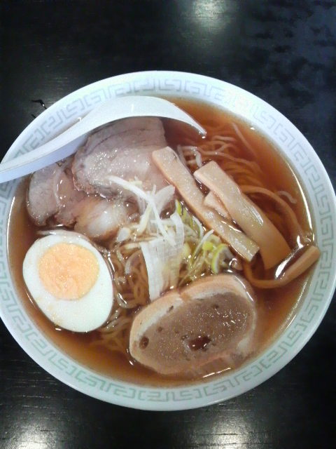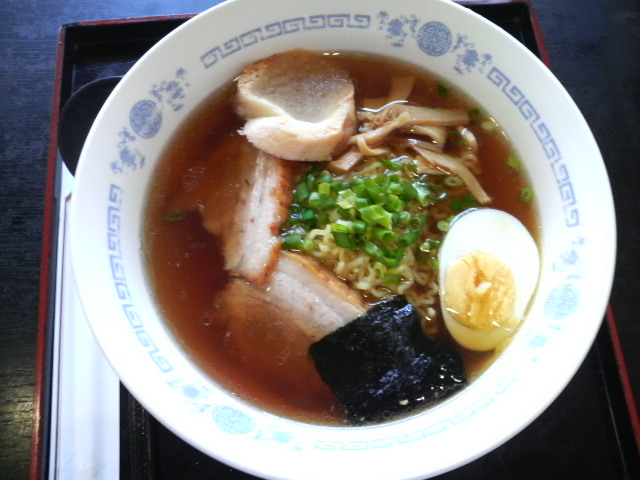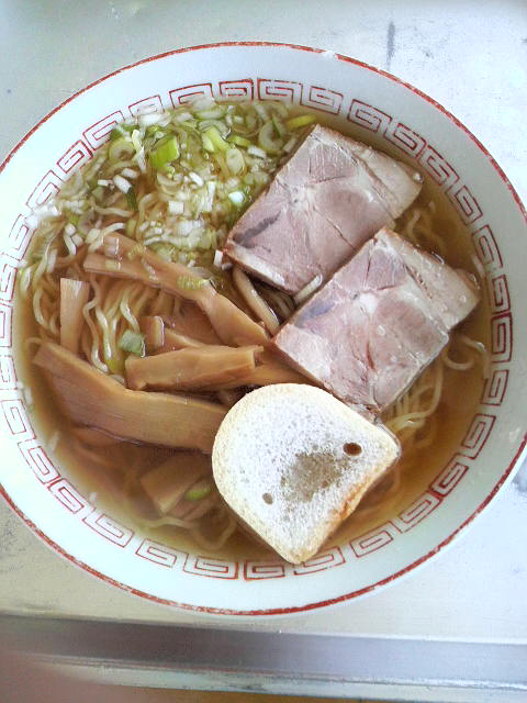 ラーメンは醤油の色と味が濃いスープに中太麺、それにメンマとネギがたっぷり。チャーシューは片側に脂身がたっぷり付いた昔懐かしい物。