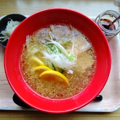 数種類あるラーメンの中での一番人気「ゆず塩れもん」をいただきました。麺はストレートと縮れ麺の2種類があり、縮れ麺にしました。ゴマが浮くあっさりした塩味でスライスレモンの風味が爽やか。細縮れ麺といい、能代市の名店「十八番」系の印象を受けます。鍋谷製麺の麺なのかな?具は他にバラチャーシュー、メンマ、白髪ネギが入ってます。備え付けの自家製ラー油には数種類のナッツが入ってます。途中で投入したら益々十八番を彷彿とさせて美味しい。サービスのモヤシナムルも美味しいです。
