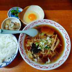 結果、ご飯が丼にモリモリで腹いっぱいになりました。生卵がついてきたのですが、ラーメンに入れて月見ラーメンにするか、卵かけご飯にするか悩みましたが、ご飯にかけました。