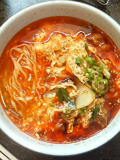 真っ赤なスープですが見た目ほど辛くなかったです。同じ値段でカルビうどんもありますよ。