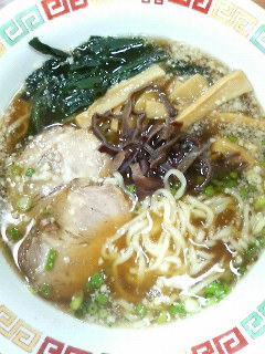 ラーメンはオーソドックスな青森スタイルで、片側に脂身があるしょっぱいチャーシューと、メンマ、麩、ナルト、ネギ。