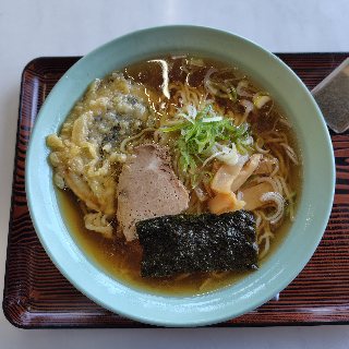軽米ラーメンをいただきました。南部せんべいの天ぷらが入った醤油ラーメンです。