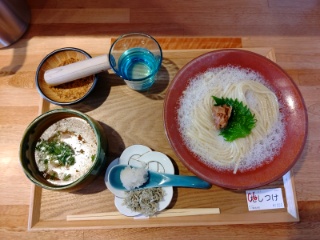 昆布水を絡めた麺に梅肉が乗ってます。他にとろろ昆布、大根おろしが付いてきます。カウンターには生七味やペッパーもありお好みで使いながらいただきます。