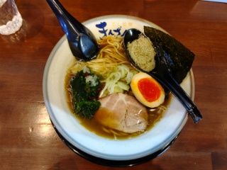 煮干し、宗田節、サバ節などの節系で取ったスープで動物系は使っていない。それだと蕎麦つゆっぽくなるのでラード、鶏油を使用。具はバラチャーシュー、極太メンマ、ネギ。