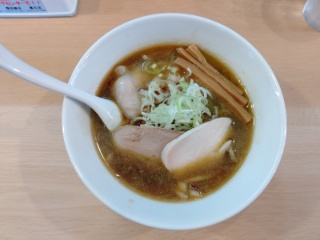 煮干そばの太麺をいただきました。煮干しの旨味たっぷりな味わいのあるラーメン。もっちりした太麺との相性もよく、香味油の加減も程よい感じです。具はジューシーな豚、鶏チャーシューに、メンマ、ネギ、ザク玉が入ります。