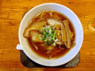 拉麺をいただきました。あっさり系醤油ラーメンで味は濃い目のスープにモッチリした中太ストレート麺。具はバラ肉チャーシュー、ネギ、メンマ。