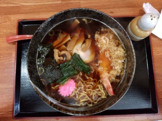 ラーメンをいただきました。注文してからメニューを改めて見てみると、うどんの下に「天ぷら、玉子(各50円)」というのを見つけて天ぷらを追加しました。キョトン顔で、うどんに入れるかき揚げですよと言われましたので、天中華にして食べるはこの店では初めてなのだろうか。
