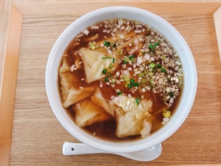 中に具がぎっしり詰まったワンタンと細麺にメンマ、ネギ。スープはあっさりとしてとても熱々です。
