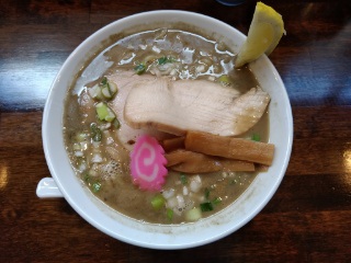 濃厚系の煮干しスープに麺は縮れのある平打ち麺。具は鶏と豚の二種類のチャーシュー、メンマ、ネギ、ナルト、大根おろし、レモン。